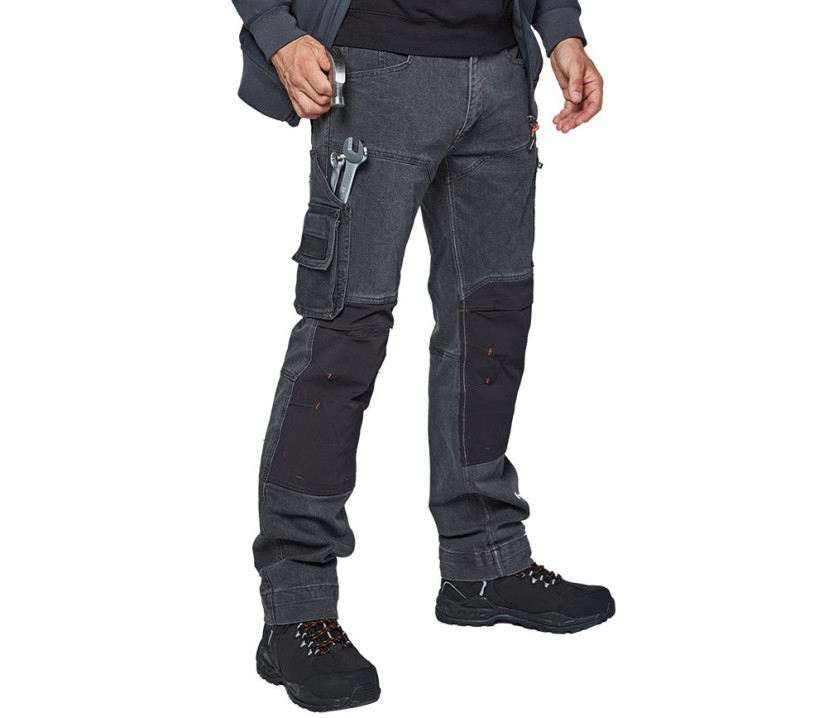 Die Hose hat einen sportlich-modernen Look in Grey Jeans (CMYK 45/38/41/21), der sowohl in handwerklichen als auch in technischen Berufen getragen werden kann. Die schlanke Linienführung und die Stretchfunktion sorgen dafür, dass sie wie eine zweite Haut sitzt, ohne einzuengen.